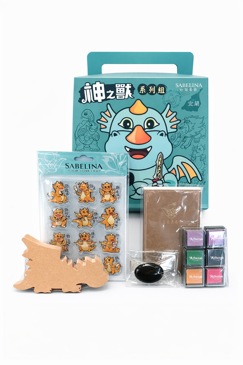 內容物:水晶圖章*1、手把壓板*1、布用印台*6、手帳本*1、造型木頭*1